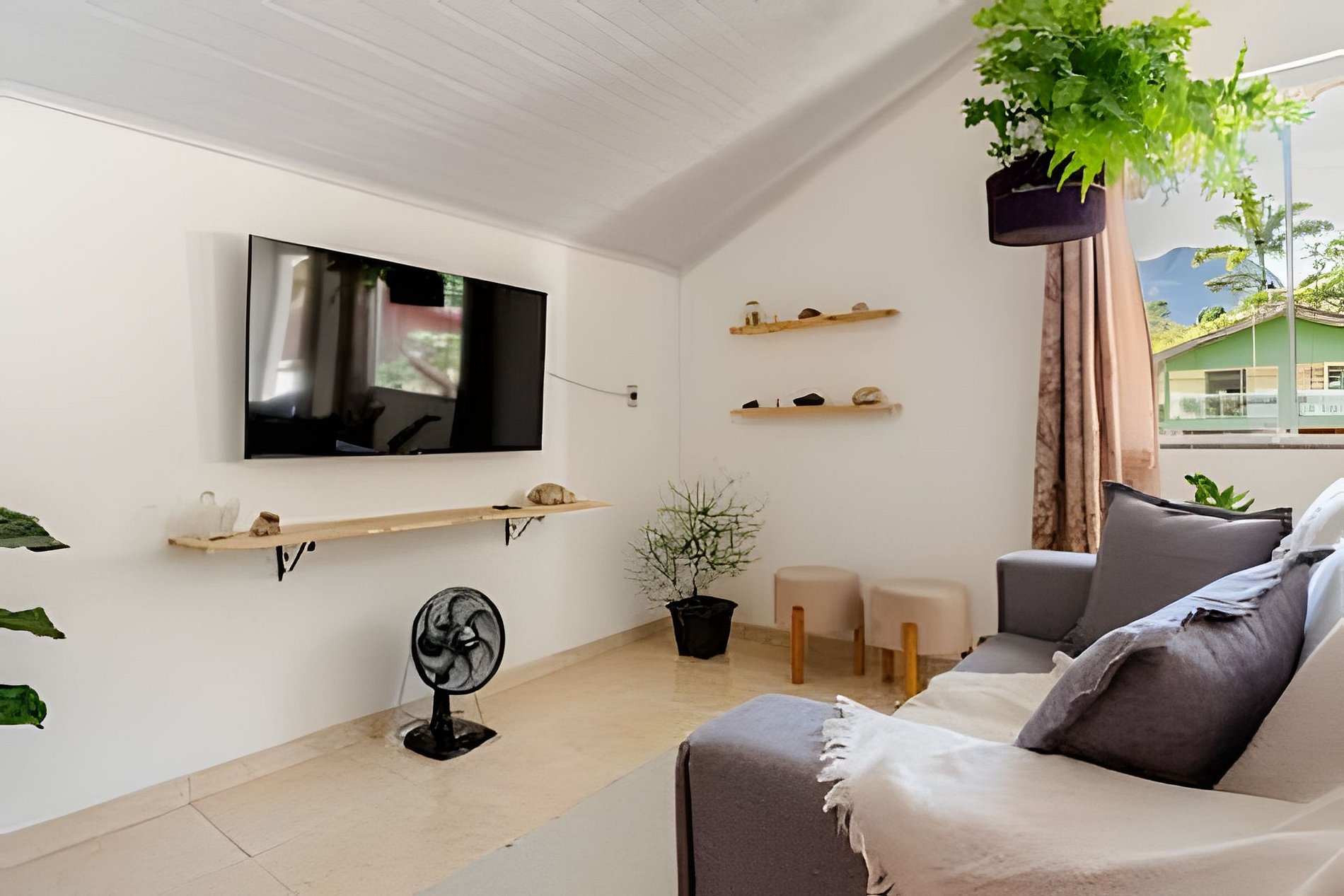 • Sala com luz natural abundante com sofá confortável, Smart TV e jogos